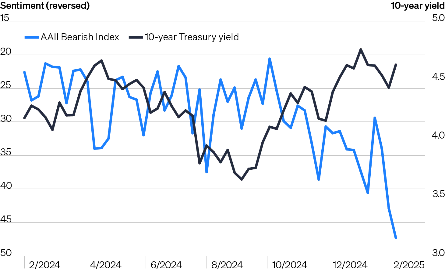 - Bloomberg Intelligence, L.P. as of February 13, 2025. AAII Bearish Index refers to the percentage of investors surveyed by the American Association of Individual Investors (AAII) who believe stocks will decline over the next six months