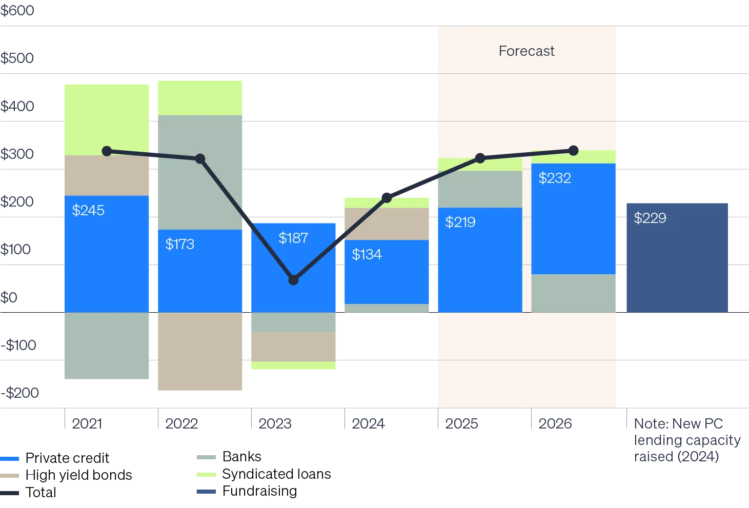 • Yet, its growth has primarily resulted from private credit strategies taking market share from banks and public markets, not a marked increase in the overall debt pie. Current fundraising levels (dark blue column at right) are generally in line with expected demand, not pointing to overcapacity.