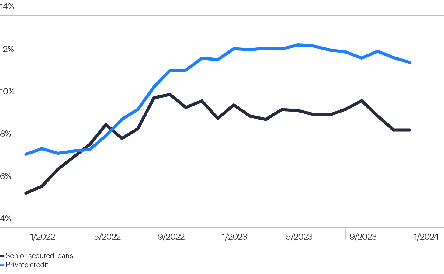 - J.P. Morgan as of January 2024. Private credit yields based on a composite of J.P. Morgan private credit transactions’ yield to maturity at transaction close. Senior secured loans based on J.P. Morgan Loan Index.