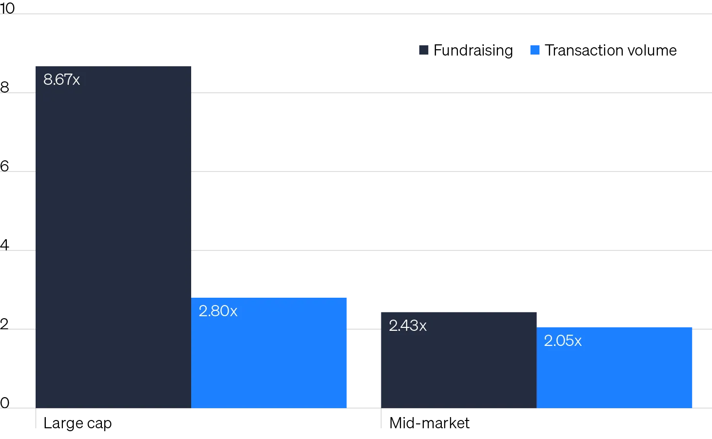 - Pitchbook, Future Standard, as of December 31, 2023. Multiples represented by North American and European PE buyout enterprise value/EBITDA. Large- and mega-cap multiples represent averages for transactions of $1 billion or more. Mid-Market represent averages for transactions between $100 million and $1 billion.