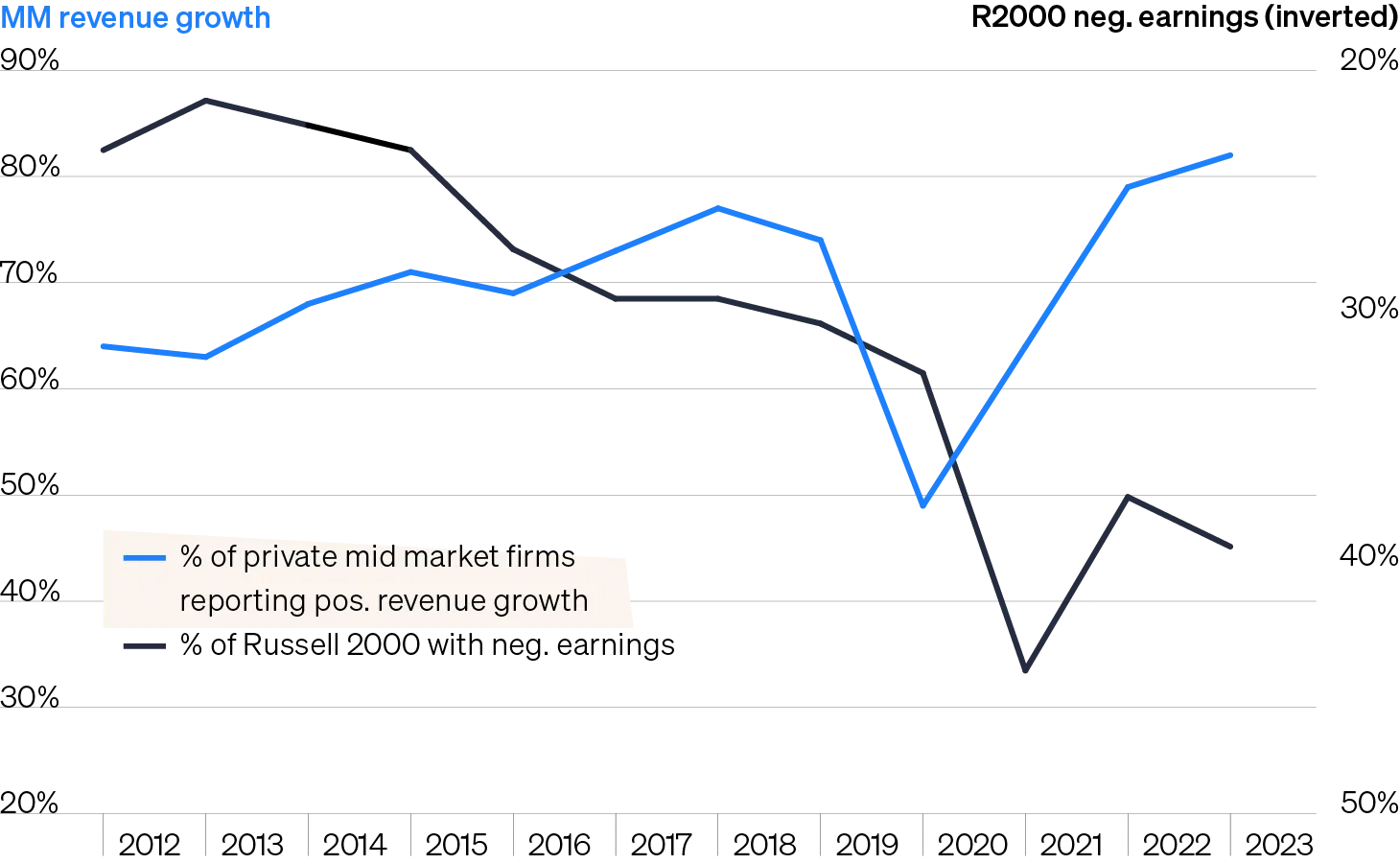 - Macrobond and Bloomberg Finance, L.P., as of December 31, 2023. Annual middle market revenue growth figures represent quarterly averages.