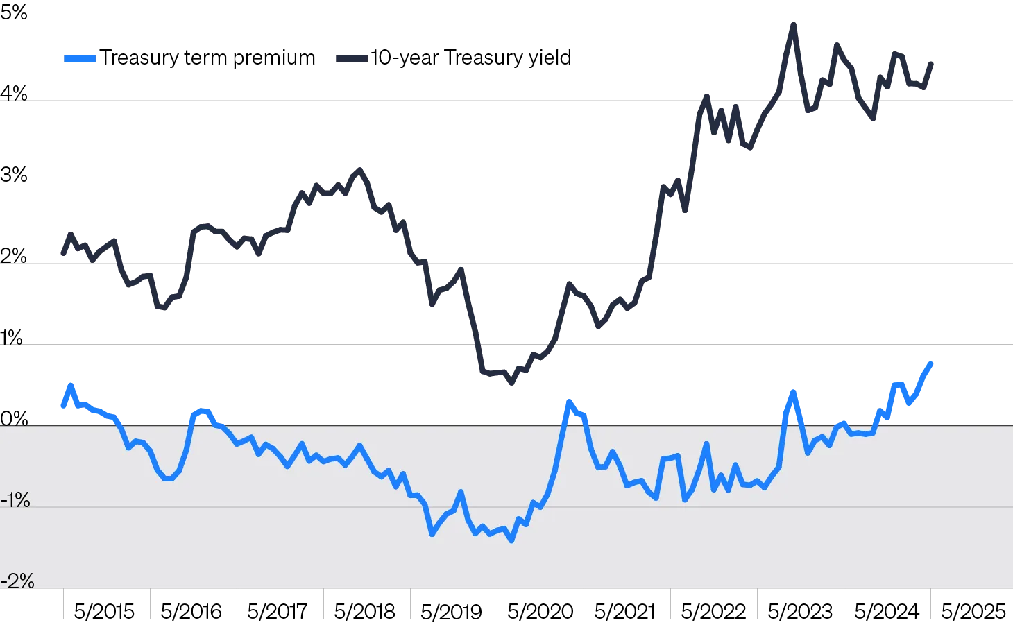 The elevated Treasury term premium may reflect growing concern over U.S. debt levels and geopolitical tensions.