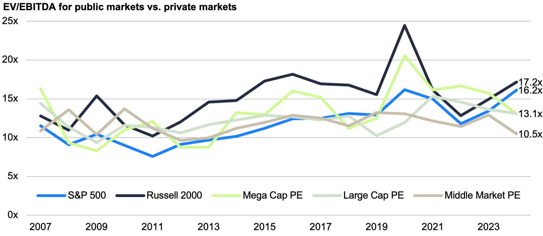 Source: Bloomberg Finance, L.P. Data for U.S. middle market as of June 30, 2024, latest data available. S&P 500 and Russell 2000 constituent index data as of September 30, 2024. Russell 2000 constituent index excludes financials and companies with less than $25mm EBITDA. The constituent population totals 792 companies.