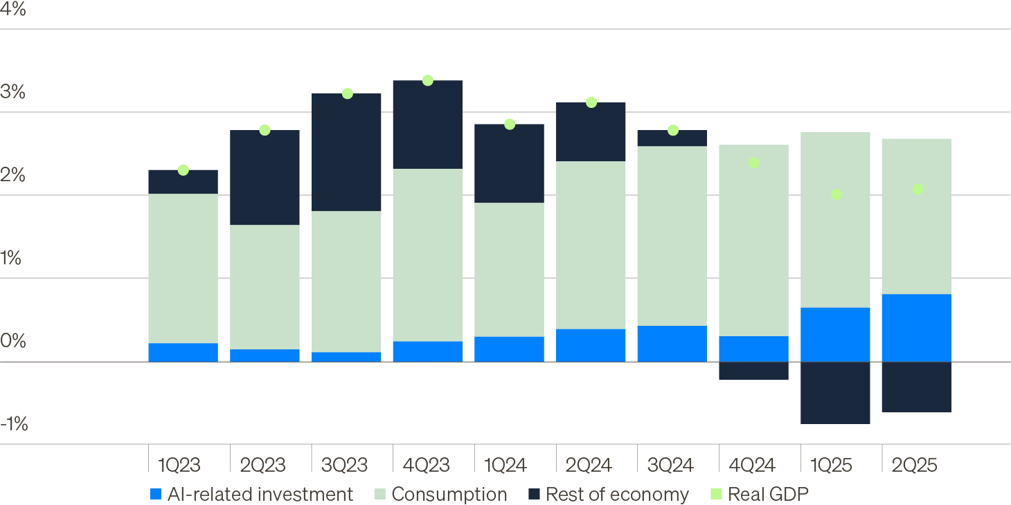 The categories of business investment where most AI infrastructure investment is captured—largely data centers, the hardware that goes inside data centers, and software—have added 0.8 percentage points to GDP growth over the past year.