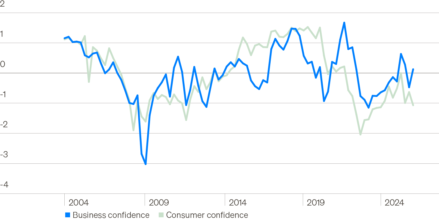 One trend we have been following for some time is the persistent gap between soft economic indicators—such as surveys—and hard indicators like consumer spending and GDP growth. This gap has narrowed in certain areas, most notably the labor market, but hard data has broadly outpaced soft data consistently since 2022. This has resulted in an understandable reexamination of the usefulness of surveys, particularly as a means of predicting future economic activity. Over the past few months, a new gap has opened up within sentiment indicators, as consumers, businesses and investors are all feeling differently about the current economic environment.