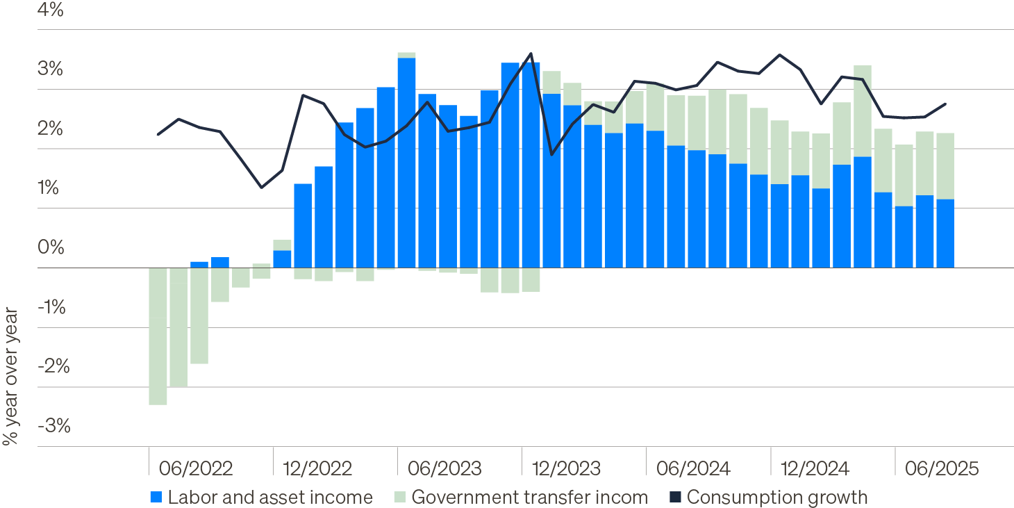 Since the tariff shock of Q1, U.S. consumers have generally continued to spend at the pace they had been in 2023 and 2024. Real consumption has risen at a 2.5% annualized pace since April, a level consistent with a healthy economy.1 However, this strength stands in contrast to slowing real income growth, which is the chief funder of household consumption. With population growth stalled by immigration policy and wage growth at risk of moderating, it is reasonable to expect that aggregate household income growth will remain challenged. The question is whether that presages a slowdown in consumer spending.