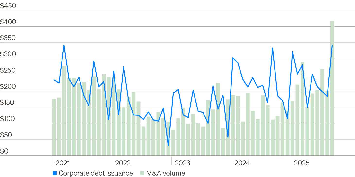 Note: debt issuance is comprised of gross issuance activity for investment-grade bonds, high yield bonds, syndicated loans, and direct lending deals. M&A volume includes corporate M&A and private equity investments.