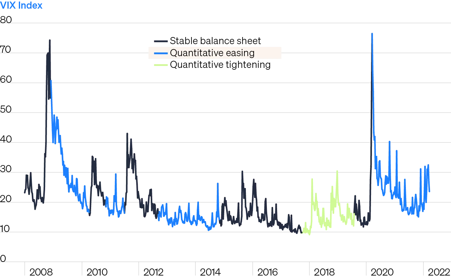 - Bloomberg Finance, L.P., FS Investments. Line shows VIX Index while colors indicate Fed policy. Time period displayed from January 2, 2008—March 23, 2022.