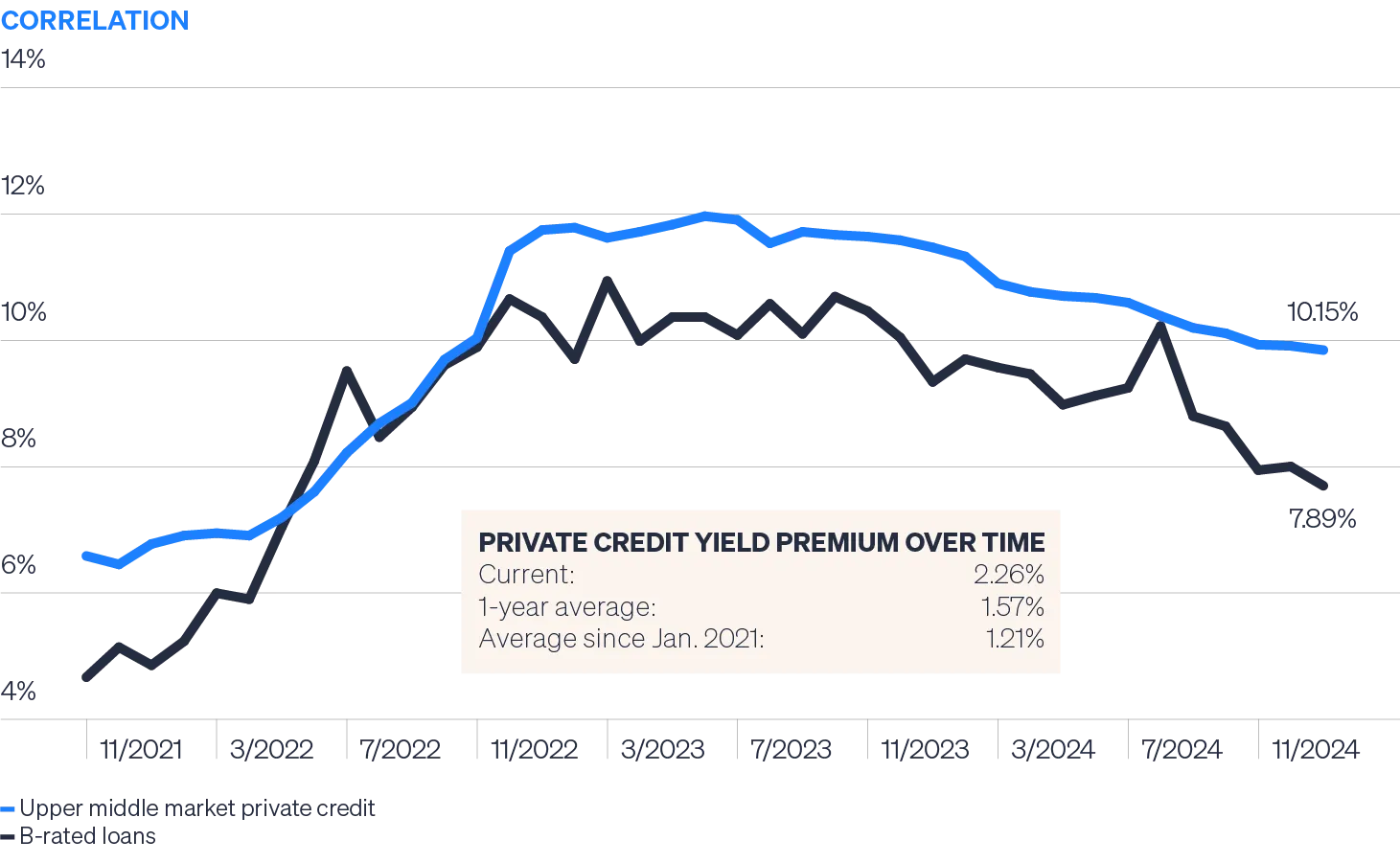 - KBRA DLD, as of January 31, 2025. Upper middle market private credit refers to companies with earnings before interest taxes, depreciation and amortization (EBITDA) of 100 million or more.